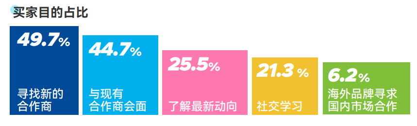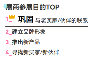 巩固与老买家/伙伴的联系、建立品牌形象、推出新产品、寻找新买家/新伙伴是展商参展的前四大目的。