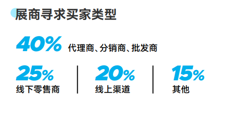 代理商、分销商、批发商是本届展商最期望合作的意向买家,占比高达40%。其次是线下零售商、线上零售商和其他渠道。